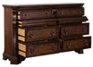 Liberty Furniture Arbor Place Double Dresser 575-BR31. Dimensions: W68 x D19 x H40. The Arbor Place Bedroom Collection by Liberty Furniture will draw attention instantly. The superb group is made of Poplar Solids & Birch Veneers in Brownstone Finish. The gorgeous sleigh bed features amazing Burnished Brass Scrolled Metal Inserts that are carried over to the matching landscape mirror. The case pieces show Canted Corner Accents, Fancy Face 4 Way Match Veneer Tops, Shaped Pilasters, Scrolled Bracket Feet, Rope Twist Mouldings, as well as Step Moulding which adds dimension. English Dovetailed Drawers are provided with Burnished Brass Drop Ring and Knob Hardware. Create the ambiance you always wanted in your master bedroom with this eye-catching collection!