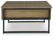 Give your space a sleek, urban edge with this lift-top coffee table. A light brown wood-tone finish and a contrasting gunmetal gray frame create a modern mixed-material look that pairs effortlessly with today's sofas and sectionals. The spring-lift top glides up to create a convenient workspace or dining surface, while dual smooth-gliding drawers keep remotes, tech and clutter neatly out of sight. This table is polished, put together and needs a good home.