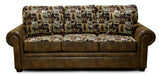 The lodge look is alive and well in our Jaden group. A three cushion style in married fabrics with pyramid legs and rolled and welted arms. Toss pillows are reversible. Novelty patterns combined with a leather-look fabrics provide the perfect choice for your cabin or retreat home. Available with or without brass nailhead trim. This collection includes a sofa, loveseat, chair, ottoman, storage ottoman, and queen sleeper.