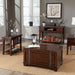 Traditional table with a young attitude. Trunk cocktail features cedar lined interior with rustic features of corner metal accents and metal strapping. Round cocktail features adjustable bar to raise the height of the cocktail from 16 to 21”. Sofa table works as media console with center opening for sound bar.